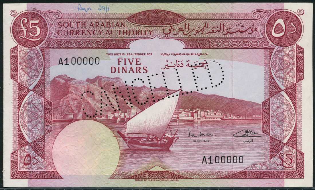 (†) South Arabian Currency Authority, specimen 1 and 5 dinars, ND (1965), serial numbers A1 00000, blue and red respectively, dhow at centre, city and shoreline behind, value at each corner, perforated CANCELLED, both with Owen signature