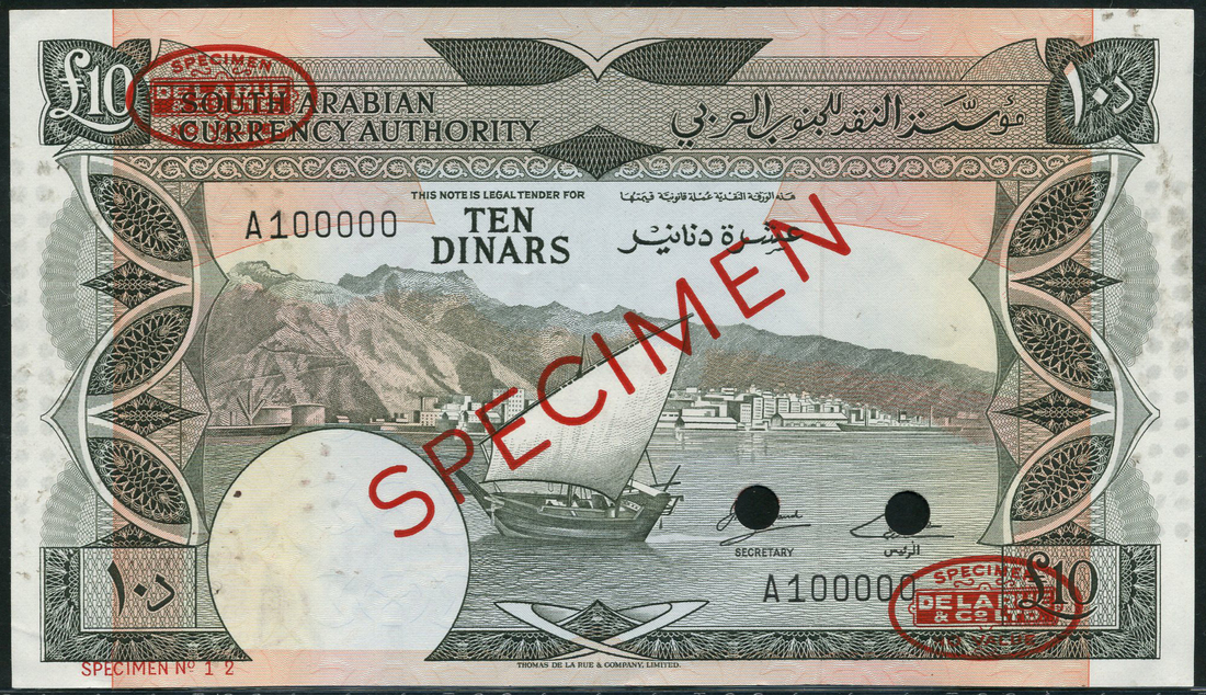(†) South Arabian Currency Authority, specimen 5 and 10 dinars, ND (1965-67), prefixes A1 and E5, red and brown respectively, dhow at centre, city and shoreline behind, value at each corner, red SPECIMEN overprints and De La Rue ovals, both with Ireland signature