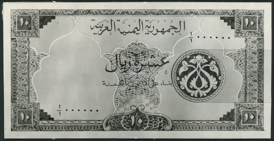 Yemen Currency Board, obverse and reverse printers archival photograph showing a design for the 1964 issue of 10 rials, black and white, obverse same as that issued but with ornate design at right, and no arms at right, also central text different, reverse same as issued, but in reverse