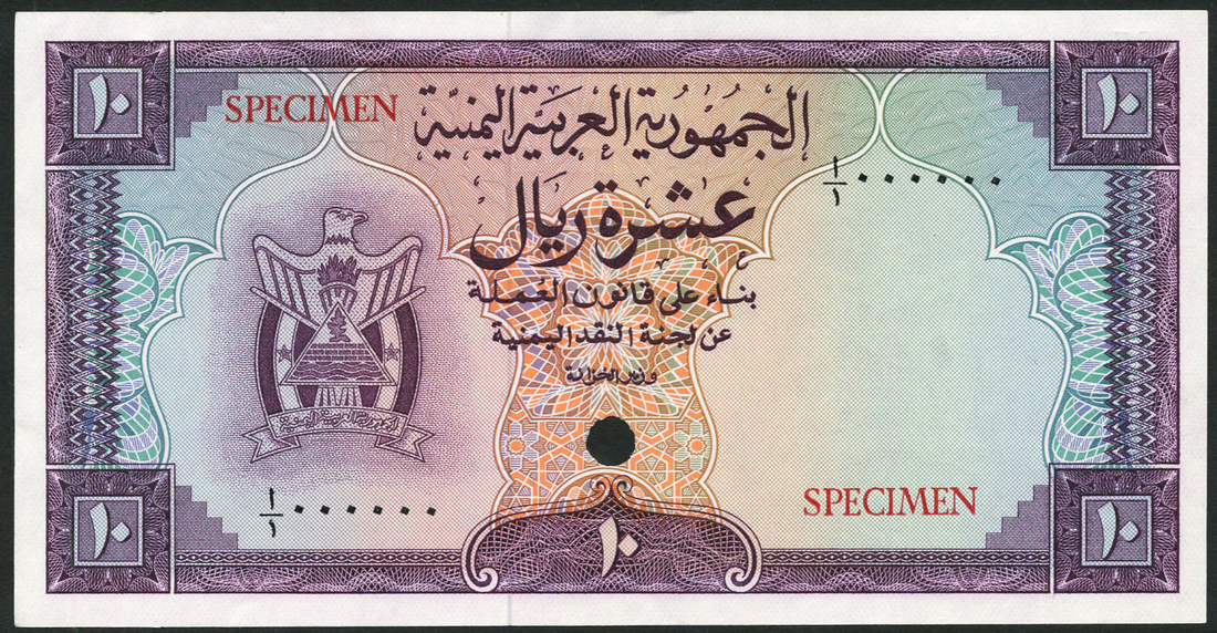 (†) Yemen Currency Board, specimen colour trial set of the ND (1964) Issue, all Arabic serial number A/1 000000, all coat of arms at left, comprising 1 Rial, blue, reverse houses and minaret in Sana'a; 5 Rials, olive-green, reverse Lion of Timna sculpture; and 10 Rials, purple, reverse dam, all overprinted SPECIMEN in red twice on obverse and once on reverse, one punch hole