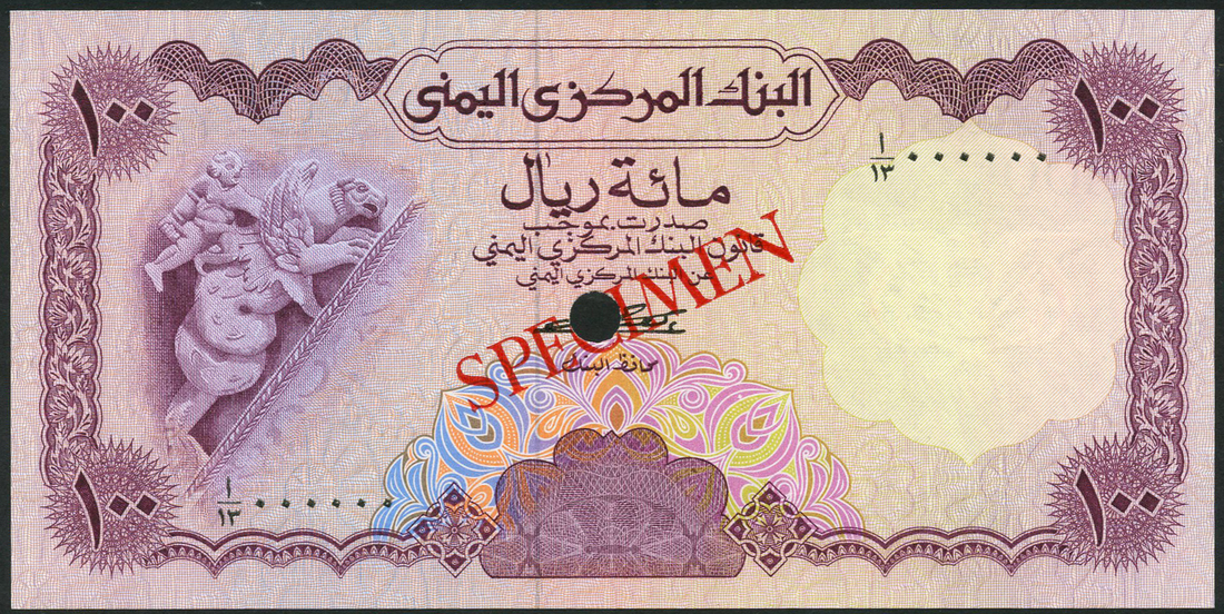 (†) Yemen Currency Board, specimen colour trial 20 Rials, ND (1971), serial number A/1 000000, green and purple, Palace on the Rock, reverse Sana'a cityscape; specimen colour trial 1 Rial, ND (1973), serial number A/1 000000, purple and brown, Al Baqilyah mosque at left, reverse coffee plants; also specimen 100 Riyals, ND (1976), serial number 1/13 000000, red-violet, marble sculpture at left, reverse view of Ta'izz, all overprinted SPECIMEN in red on obverse and reverse, one punch hole