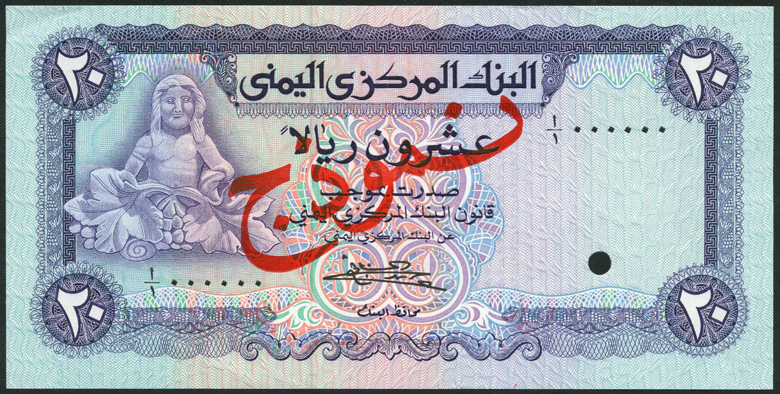 (†) Central Bank of Yemen, specimen 1 rial, green, 5 rials, red, 10 rials, blue, all ND (1973), also 25 rials, purple, all zero serial numbers, ND (1983), all al-Sanabani signature except the 5 rials which is Abdul Aziz Abdul Ghani signature