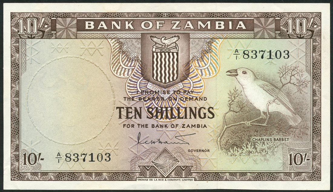 Bank of Zambia, 10 shillings, ND (1964), serial number A/1 837103, brown on multicolour underprint, Chaplins Barbet at right, arms at top centre, value at centre and each corner