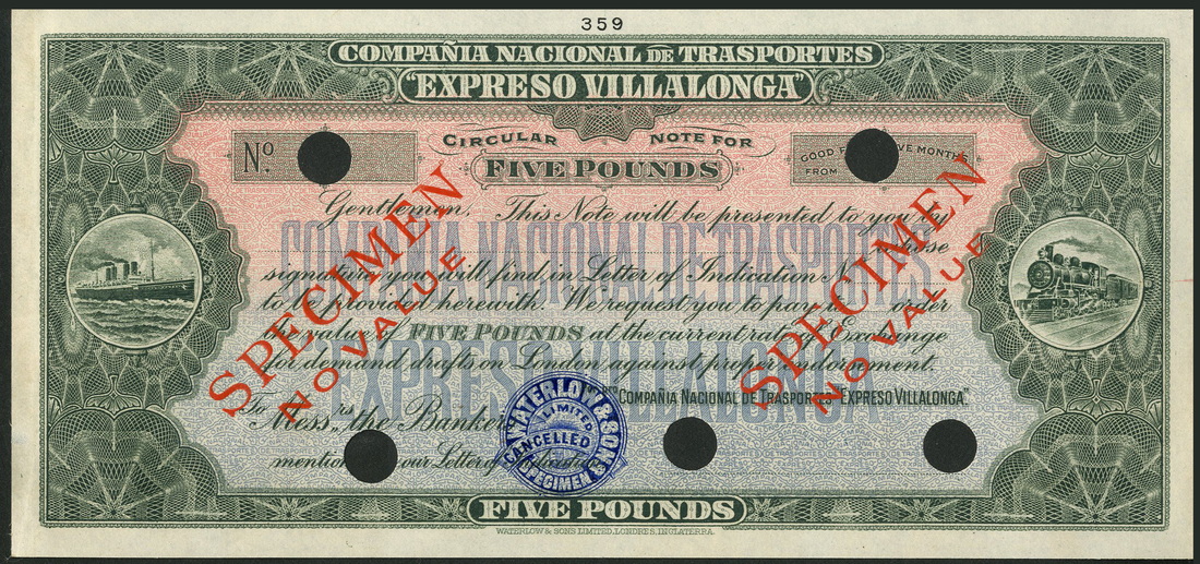 Compania Nacional de Transportes "Expreso Villalonga", a specimen circular note for £5, ND (19--), green on blue and pink underprint, steamship at left, steamtrain at right, five cancellation holes, red SPECIMEN NO VALUE overprint, blue WATERLOW & SONS roundel,