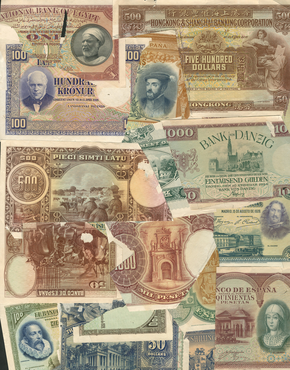 A Group of heavily damaged/chopped up specimens and colour trials, including some examples of extremely rare notes, including Egypt, £1 Fellah, colour trial in brown, and HSBC, $500 of 1927