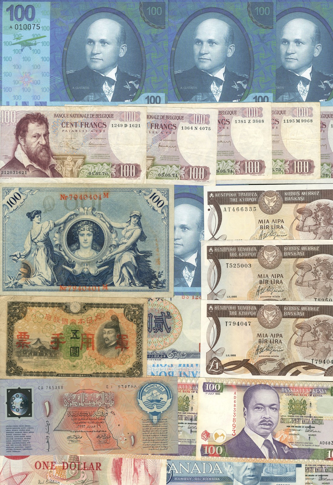 a mixed group of world banknotes, from countries which include, Belgium (including a consecutive run of 4 notes), Malta, Germany, Austria, German East Africa, France, Brazil, Cyprus, Italy, China, Kuwait, Slovenia, Afghanistan, Rhodesia, Kenya (a consecutive run of 3 notes), Guyana, Canada, Lithuania (a consecutive run of 4 notes),