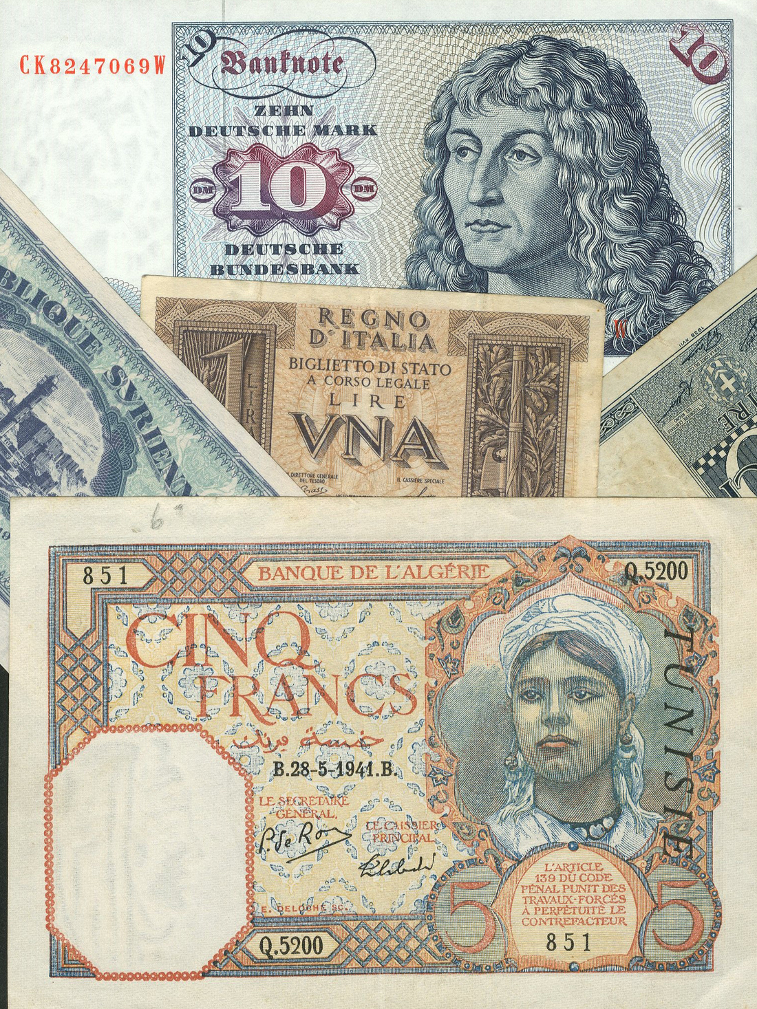 an interesting mixed group of notes comprising, Banque de Syrie et du Liban, 1 livre, 1 September 1939, serial number J/CX 051,249, green and multicolour, Columns of Baalbek at left, black overprint LIBAN, reverse, orange, city view at centre, also Republique Syrienne, 5 piastres, 15 February 1944, green on pale green underprint, reverse, blue and light blue, Citadel of Aleppo at centre, Germany, ND (1970-80), 10 deutsche mark, serial number CK8247069W, blue and multicolour, Regno D'Italia, 1 lire and 10 lire, and Banque de L'Algerie, Tunisia, 5 francs, 1941