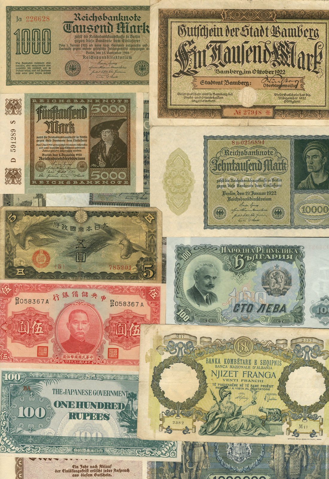 a large group of mixed world banknotes, from countries which include, Germany, Ukraine, Poland, Albania, various Japanese occupation notes, China, Allied Military Currency, Philippines, Military payment certificates, Carcassonne ration coupons, Romania, Greece,