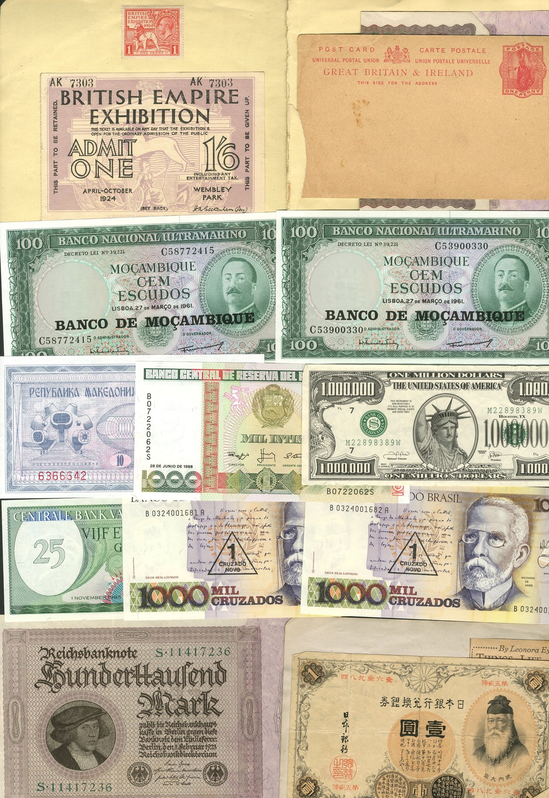 group of mixed world banknotes, from countries which include, Germany, China, Mozambique, USA, Suriname, Brazil (two consecutive notes), Peru, Latvia, Macedonia