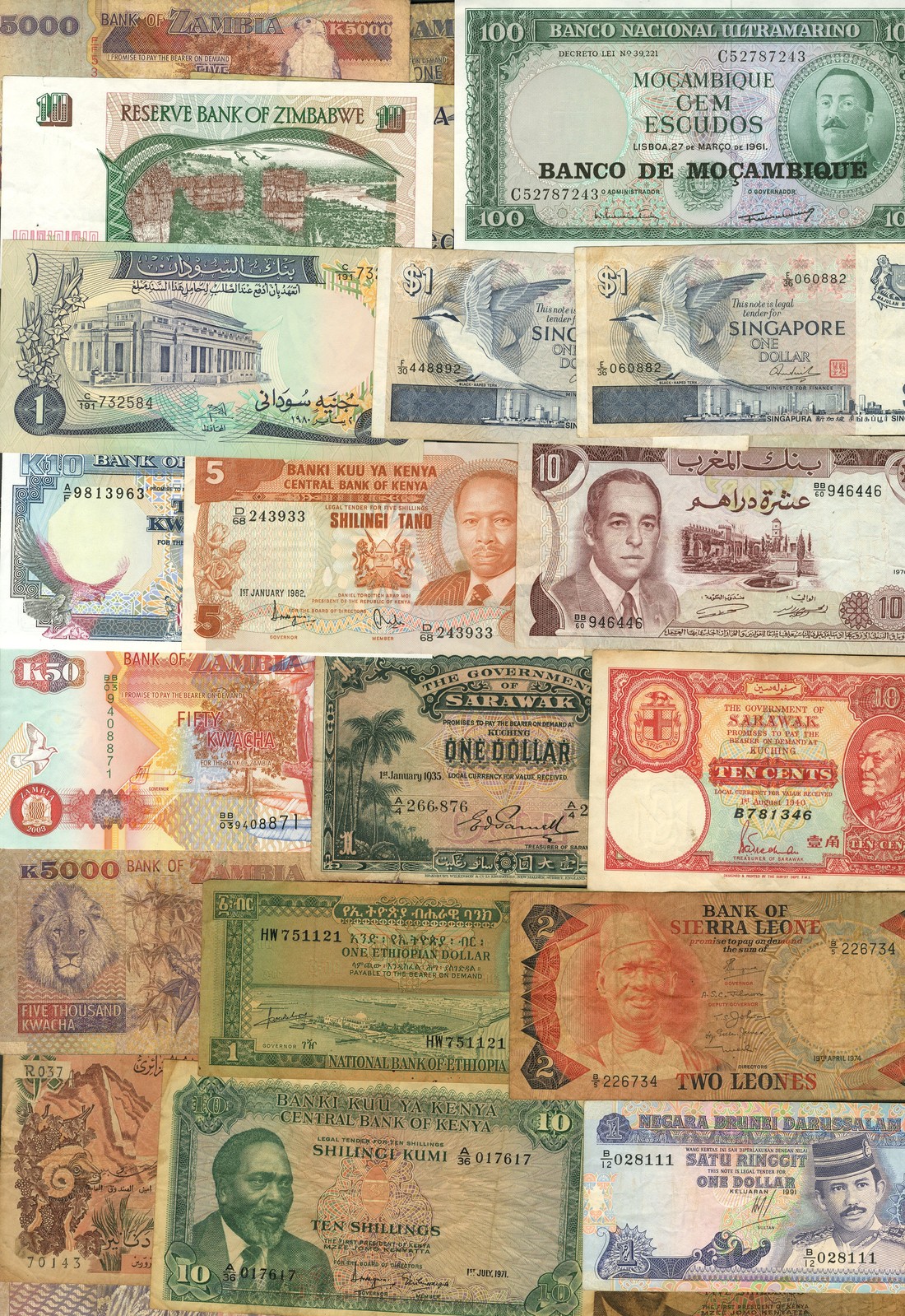 a group of world banknotes, including, Government of Sarawak, 10 cents, $1, 1940, Board of Commissioners Malaya, 1, 5, 10, 20 (2), 50 cents, 1941, Government of Ceylon, 25 cents, 1942, Singapore, $1 (5), Brunei, $1, also notes from Ghana, Sudan, Morocco, Zimbabwe, Zambia, Mozambique, Kenya, Sierra Leone, Algeria