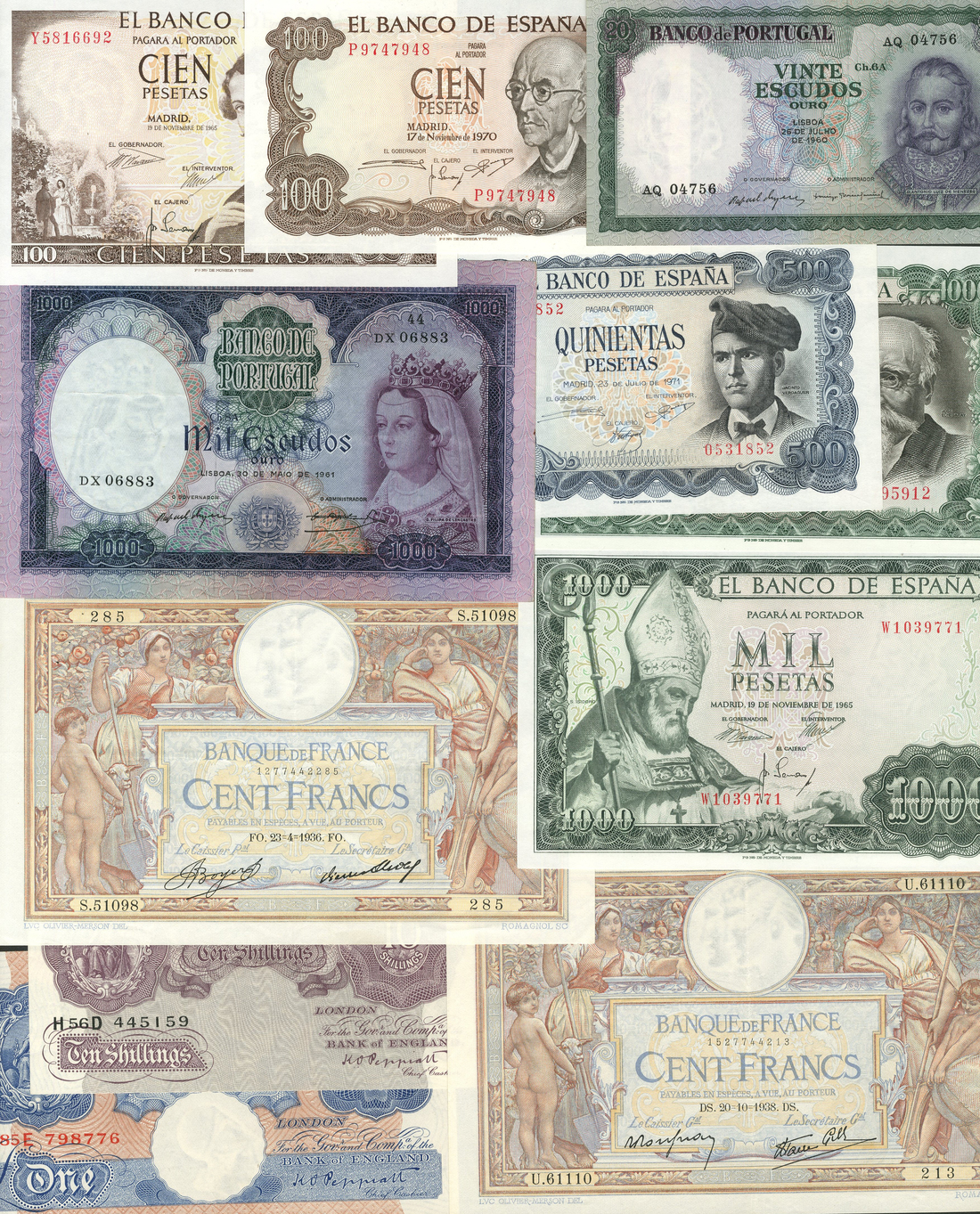 a small mixed group of world banknotes, from countries which include, Spain (2), Portugal (5), France (2), United Kingdom (2)