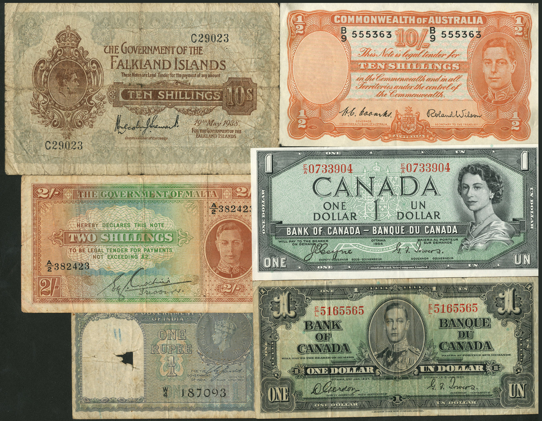 Commonwealth, a selection comprising Bank of Canada, $1, 2 January 1937 and 1954 (Pick 58, 66), The Government of The Falkland Islands, 10/-, 1938 (Pick 4), The Government of Malta, 2/-, 1971 serial number A/2 382423 (Pick 17), Government of India, serial number W/4 187093, Commonwealth of Australia 10 shillings, 1952, serial number B/9 555363