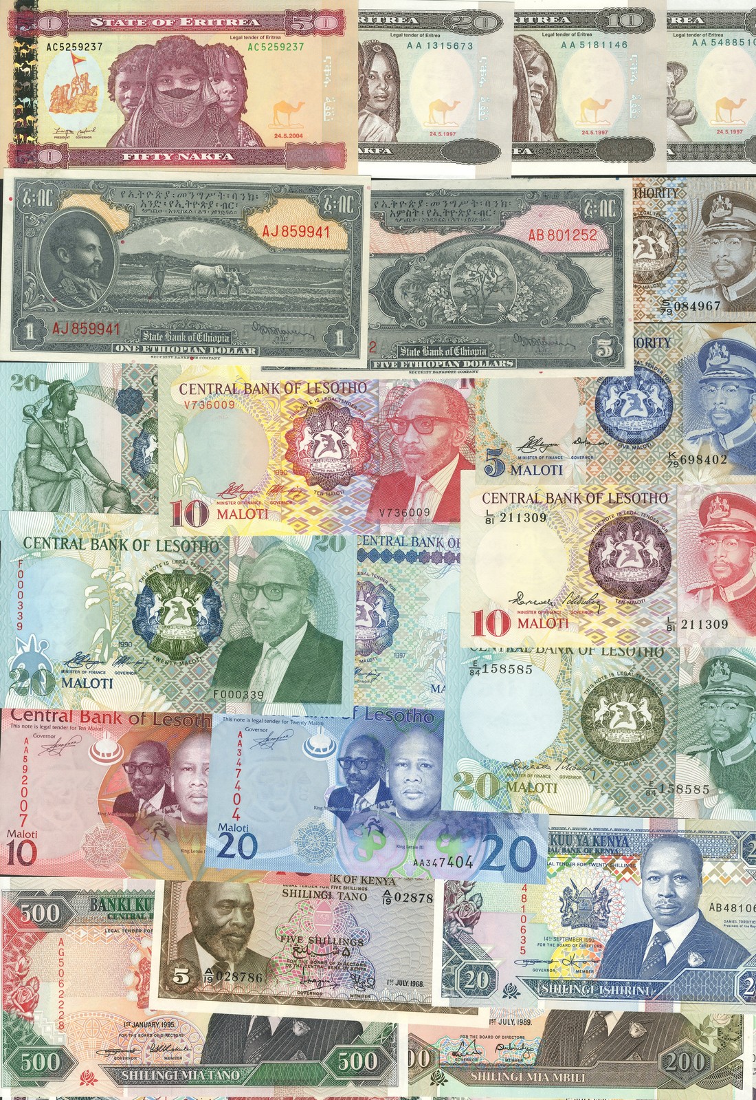 a large group of world banknotes, including the following, State of Eritrea, Ethiopia, Lesotho, Kenya