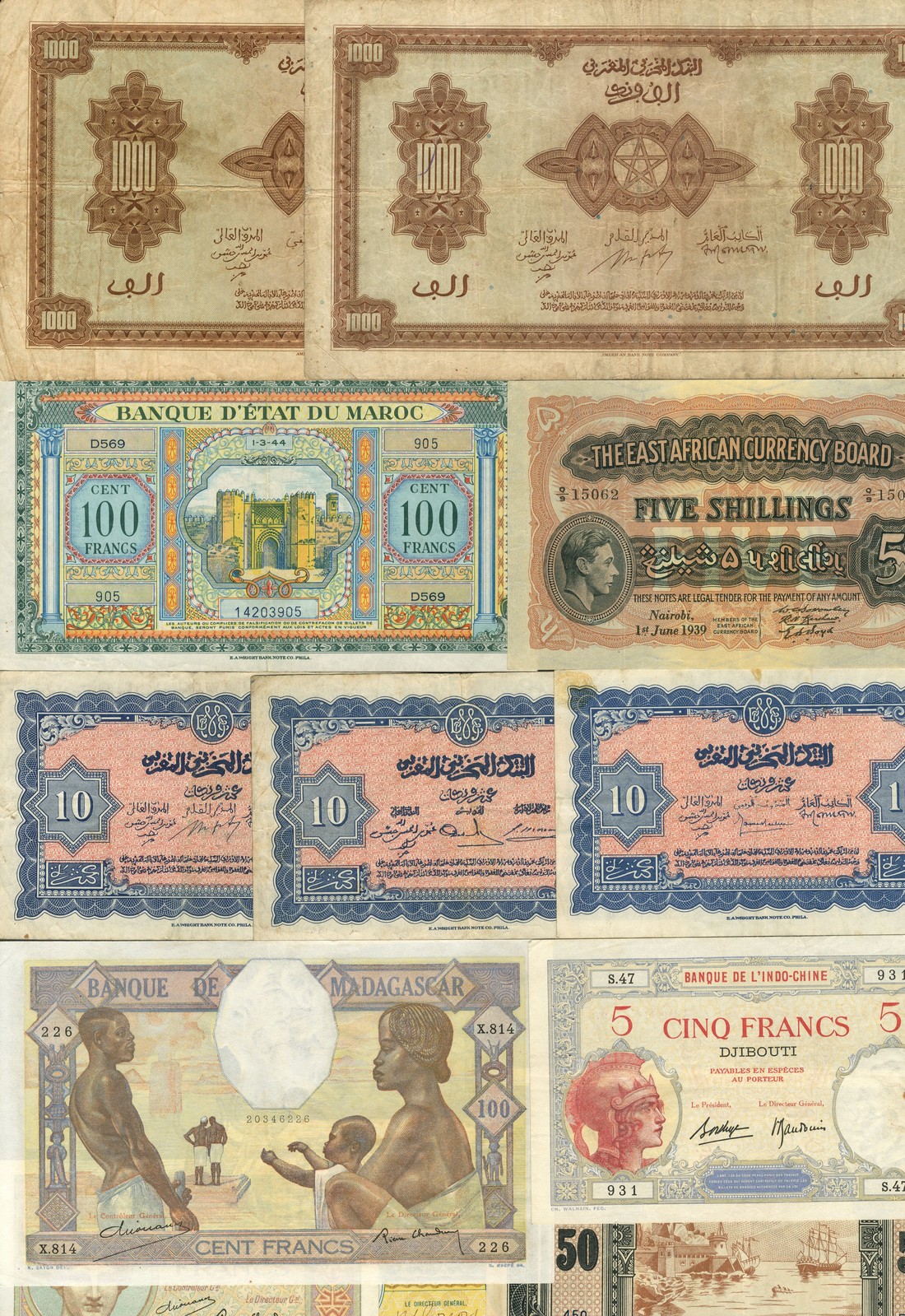 a mixed group of world banknotes, including the following, East African Currency Board, 5 shillings, 1 June 1939, serial number Q/9 15062, brown, portrait George VI low left, value low right, reverse lion at centre, mountain in background, Banque d'Etat, Morocco, a group of notes including 5 francs (3), 1943 (2), 1944, blue and yellow, 10 francs, (3) 1942 (2), 1944, green and blue, 50 francs, 1943, black and brown and 100 francs, 1944, blue and orange-yellow, 1000 francs, 1 March 1944, red, serial no. D247-129 and 1000 francs, 1 August 1943, red serial no. M69-355, both brown and pale blue, star at centre, reverse brown, Banque de l'Indochine, Djibouti, 100 francs, 2 January 1920, serial number O.6-000, red-brown and cream, allegorical figures representing France and her colonies, d'Oissel and Simon signatures, specimen 5 francs, ND (1936-), zero serial numbers, multicoloured, helmeted female head at left, Borduge and Baudouin signatures, also an issued example, and 20 francs (2), ND (1926-), multicoloured, woman with wreath at right, both Borduge and Baudouin signatures, one with blue green value, one with red value, and Banque de Madagascar, 5 francs, ND (1937), serial number W 1760-998, green and multicoloured, Juno at left, also 10 francs, ND (c. 1937-47), serial number Z.1157 O,381, blue, woman with fruit basket, 20 francs, ND (1937-47), serial number T.874 0,826, yellow, brown and blue, France and local mother and child at right, 100 francs, ND (c.1937), serial number X814-226, multicoloured, family, reverse multicoloured, oxen