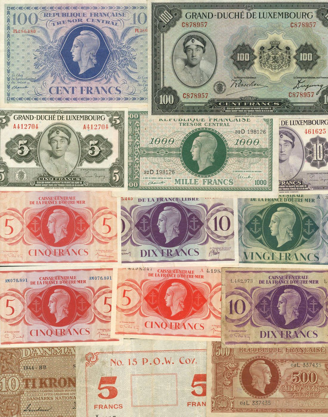 an eclectic group of world banknotes, which comprises the following, Grand Duché de Luxembourg, 5 francs, olive, 10 francs, violet, 100 francs, black, pale blue and lilac, all ND (1944), all Grand Duchess Charlotte, also Tresor Central, 100 francs, 1943, red prefix PL, blue and lilac, head of Liberty at centre, also 500 francs, brown and 1000 francs, green, ND (1944), both head of Liberty at centre, plus Empire Cherifien, card currency for 50 centimes, 1 and 2 francs, 1944, Danmarks National Bank, 5 kroner, blue and 10 kroner, brown, 1944, serial numbers AK 425983 and BR 891477 respectively, also postage stamp store currency all on 1 ore stamps (10), also officers Fenrick Messen 5, 10, 25 øre and 1 krone, Fort de la Revere, near Monte Carlo, 1 franc, black text on blue card, signed by the British officer commanding the internees, also Prisoner of War currency, No.15 P.O.W. Coy, 5 francs, World War I, serial number X/18 845, red text on pale background Caisse Centrale de la France Libre, French Equatorial Africa, a group of notes consisting of 10 francs, red prefix FC, violet and pale green-blue, head of Marianne at centre, Caisse Centrale de la France d'Outre-Mer, Saint Pierre and Miquelon, 5 francs, law of 1944, blue serial number AM 076891, red and lilac, head of Marianne at centre, Duval signature, Caisse Centrale de la France d'Outre-Mer, 5 francs, law of 1944, red prefix A with blue serial number 4,198,247 (Equatorial Africa), red and lilac, head of Marianne at centre, Postel-Vinay signature, an unissued 5 francs, law of 1944, no serial numbers, red and lilac, head of Marianne at centre, Postel-Vinay signature, 10 francs, 1944, violet prefix A, black serial number 1, 482, 973, violet and pale blue, head of Marianne at centre, and, Postel-Vinay signature and 20 francs, law of 1944, green prefix A, black serial number 3867119, green and blue, head of Marianne at centre, Postel-Vinay signature
