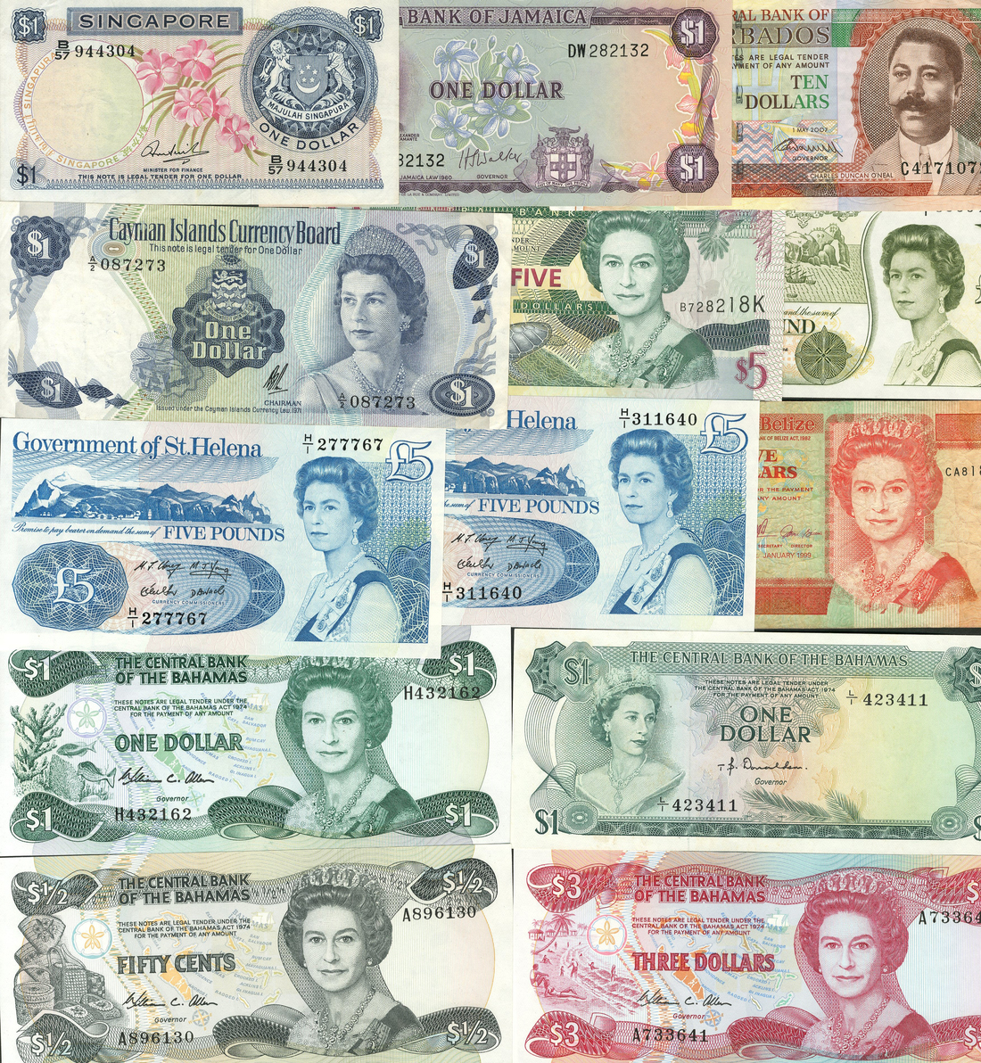 a mixed world group of notes, from countries which include, Singapore, Jamaica, Barbados, Cayman Islands Currency Board, Eastern Caribbean, Government of St Helena, Bahamas, Belize