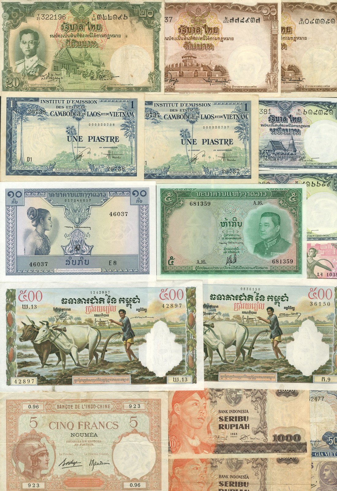 a large mixed group of world banknotes, a group of notes comprising, Martinique, Thailand, Vietnam (2 of which are consecutive), Laos, Cambodia, Noumea, Indonesia