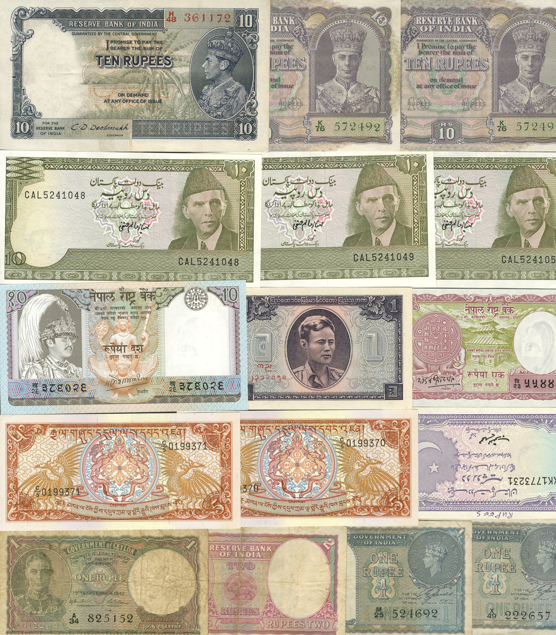 a group of world banknotes, from the following countries, India, Ceylon, Pakistan (3 notes of which are consecutive), Bhutan (2 consecutive notes), Nepal