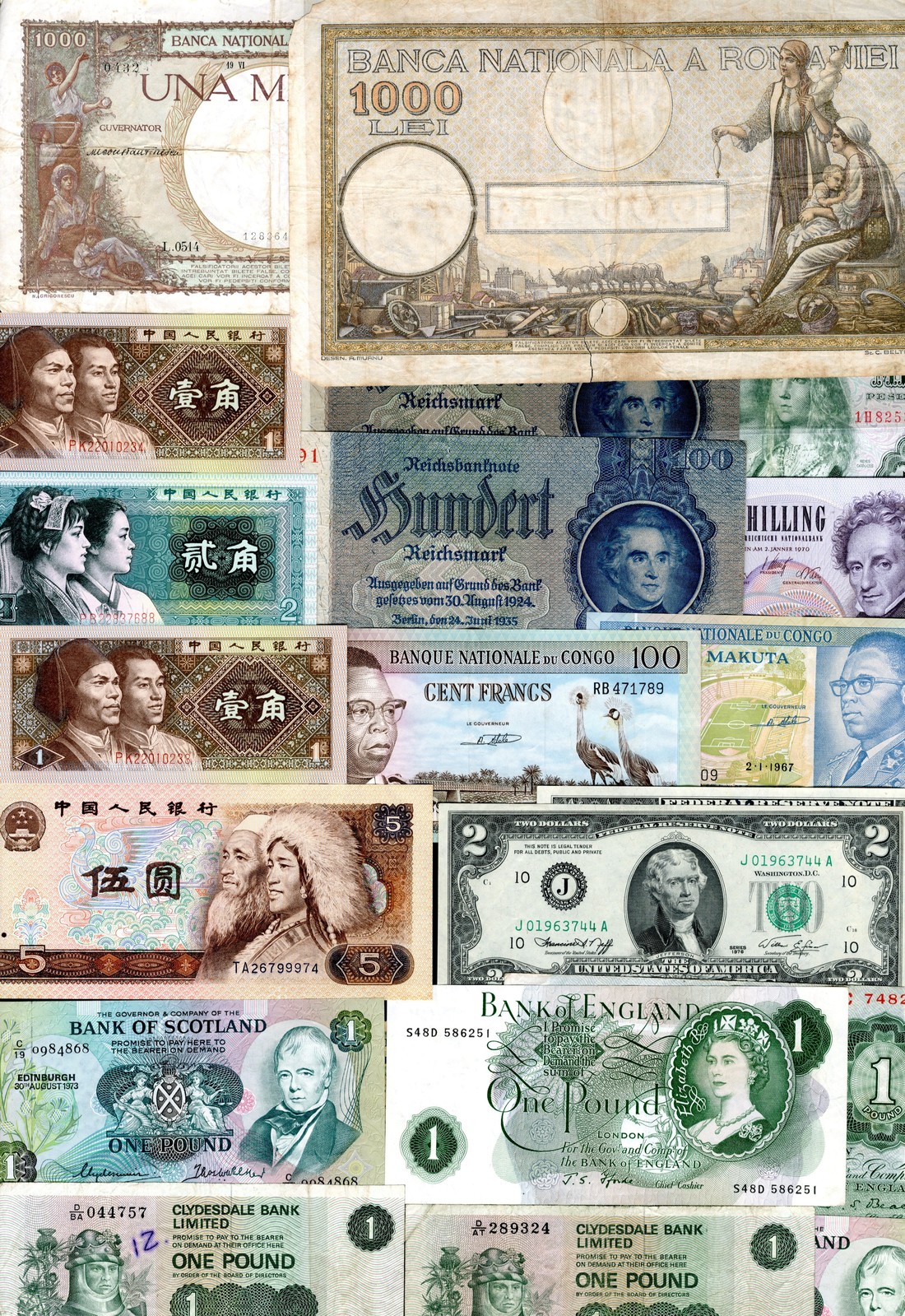 A large group of World Banknotes from various countries including People Bank of China, 1980, Central Bank of Belgium Congo 1957, Bank of England, Italy, Bank of Portugal 1971, Romania, Bank of Scotland, Bank of Spain, United States Federal Reserve Bank,