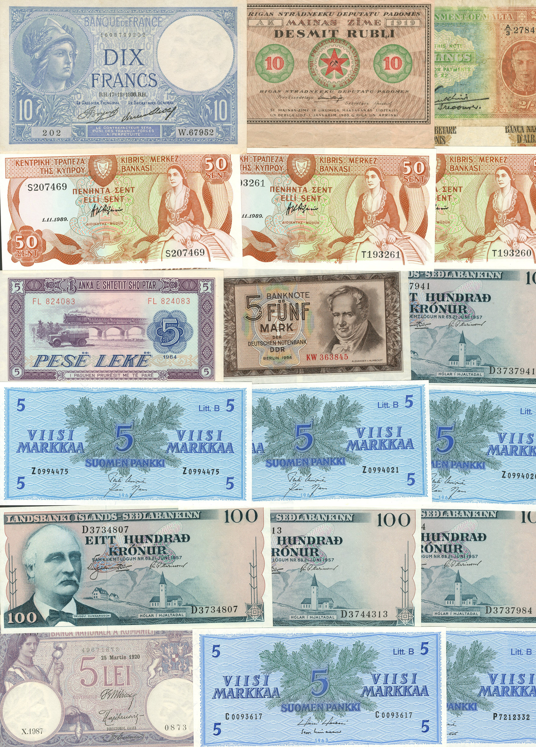 (x) A mixed group of European notes, comprising France, 10 Francs, 1936 (Pick 73e), Latvia, proof 10 rubli, 1920, Malta 2/-, 1942 (Pick 17c), Cyprus 1989 (3), (Pick 52), Albania, Bulgaria, Finland, Germany, Iceland, Romania
