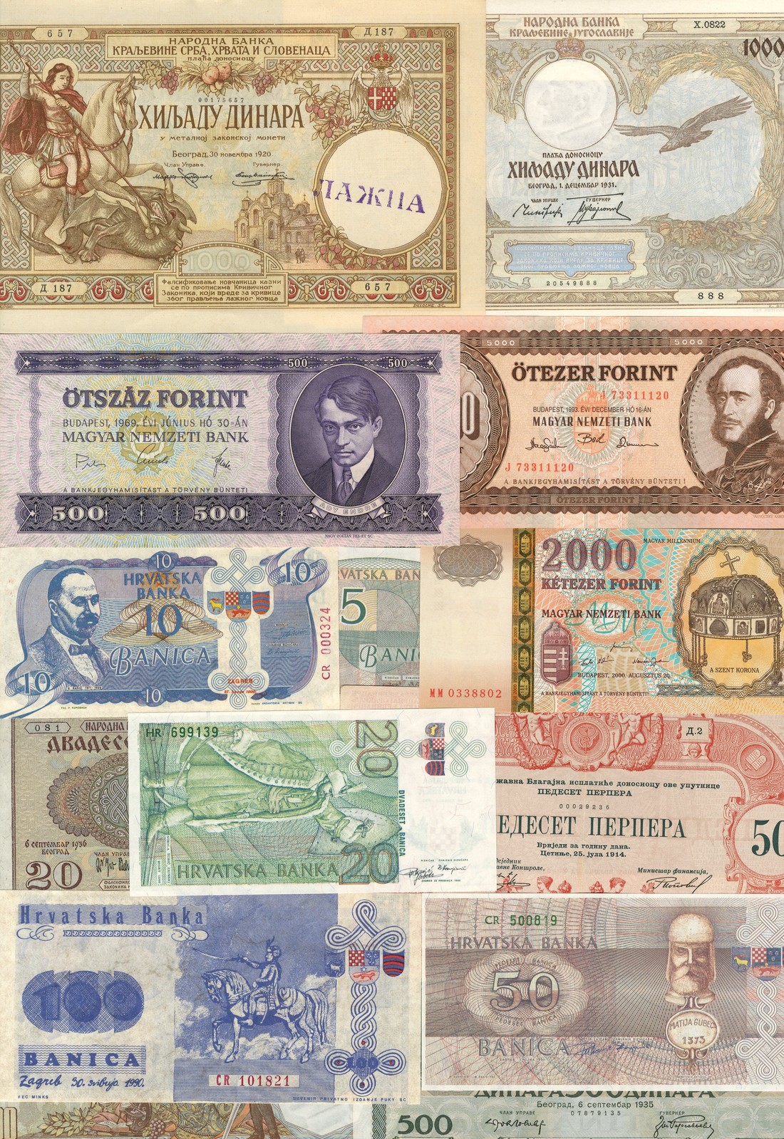 A group of European notes, comprising a set from the National Bank, Kingdom of Serbs, Croats and Slovenes, Pick 23, 27-32, Serbian National Bank, Pick 22-25, 27, 29-32, Independent State of Croatia, Pick 1-2, 5-8, 11-14, Hungary Ministry of Finance, Pick 138-144, 168-171, Montenegro, Pick 15-16, 19-20,