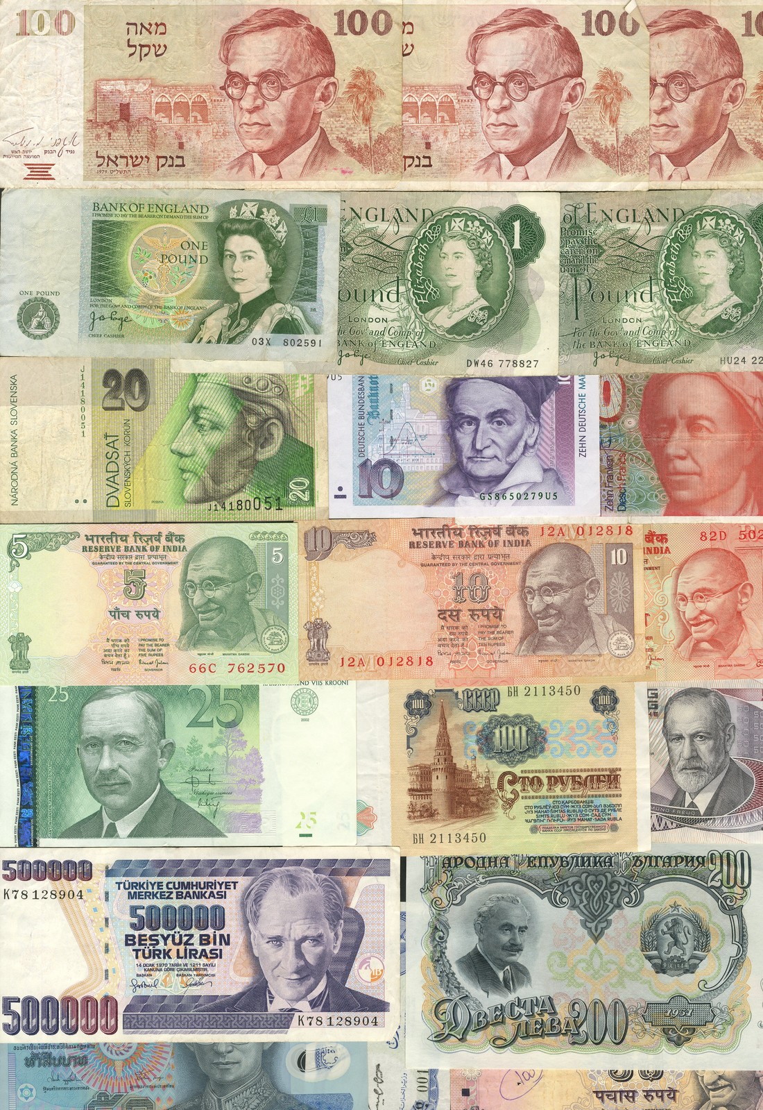 A large group of mixed world banknotes, which include the following, Japanese Government, Israel, Poland, Nigeria, Egypt, Afghanistan, Kuwait, India, Turkey, Slovenia, Vietnam, Italy, England, Germany, Portugal, Spain, Russia