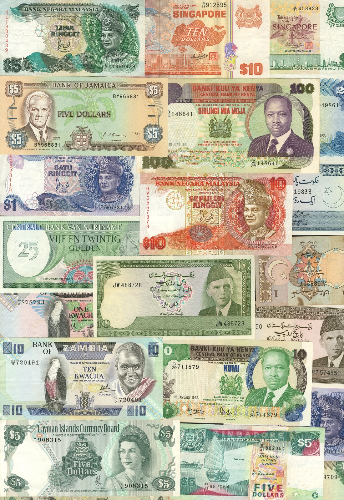 A good sized group of mixed world banknotes, including, Malaya and British Borneo $1, 1959, Bank Negara Malaysia, Singapore, Cayman Islands, Jamaica, Bangladesh, Pakistan, Suriname, Maldives, Kenya, Ghana, Zambia, Tanzania, Malawi