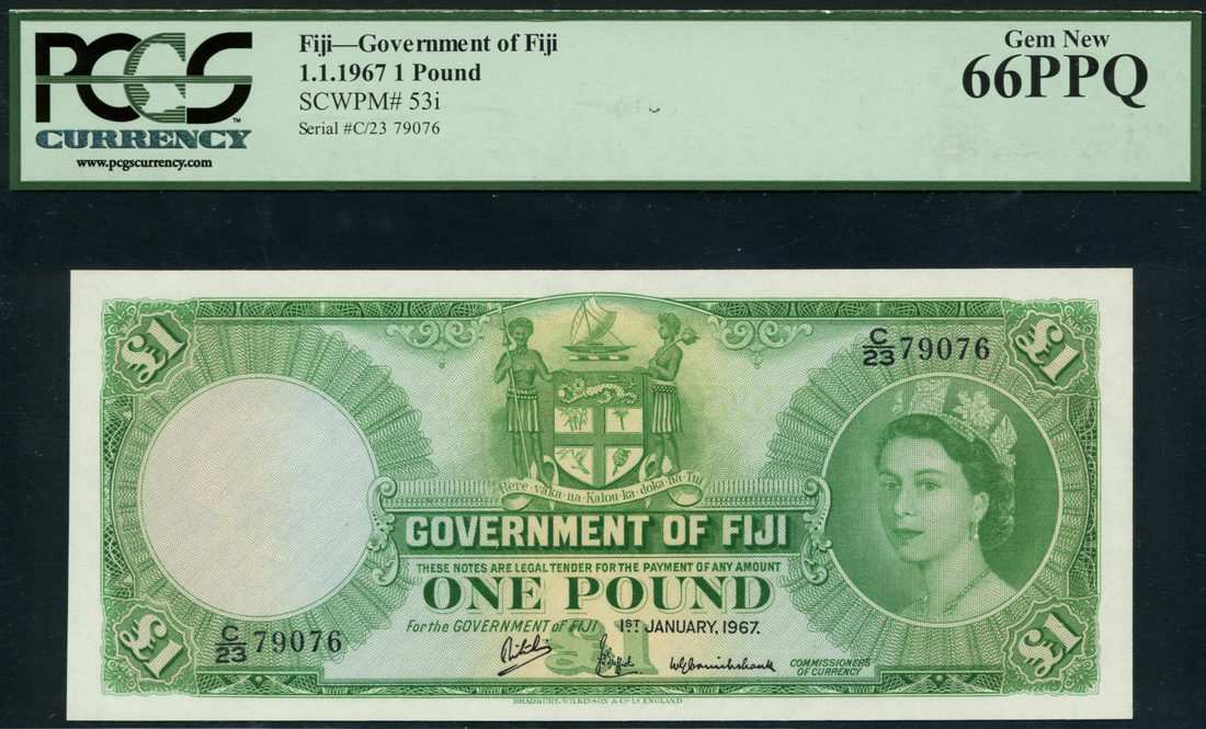 (x) Government of Fiji, £1 (2), 1 January 1967, serial number C23 79075/79076, green and pale orange, Elizabeth II at right, arms top centre, signatures of Ritchie, Griffiths and Cruikshank, reverse green, value
