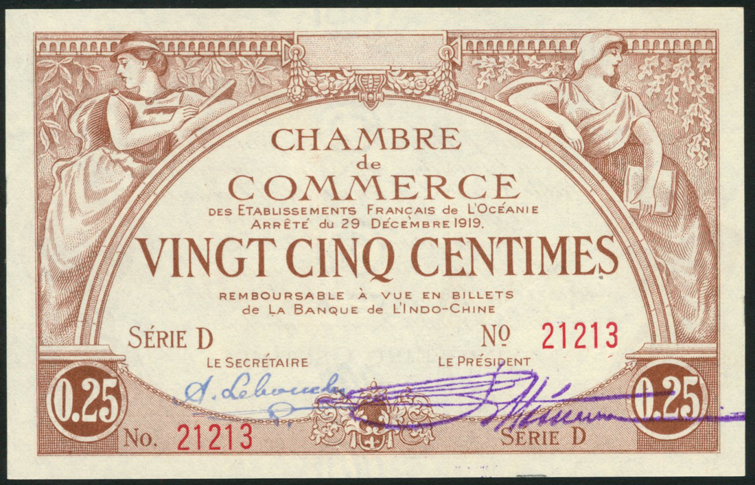 (x) Chambre de Commerce des Etablissements, French Administration, 25 centimes, 1919, serial number 21213, brown on print, maiden leaning on arch at left and right, manuscript signatures