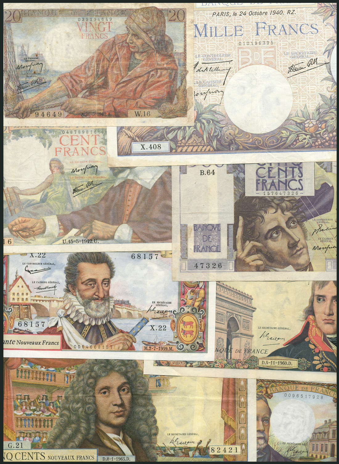Banque de France, a group of notes comprising, 1000 francs, 1940, serial number X.408 395, 20 francs, 1942, serial number W.16 94649, 100 francs, 1942, serial number N.20 89816, 500 francs, 1946, serial number B.64 47326, 50 nouveaux francs, 1959, serial numberX.22 68157, 100 nouveaux francs, 1960, serial number W.82 00646, 500 nouveaux francs, 1965, serial number G.21 82421,5 francs (2), 1966, 1969, 20 francs, 1974, 500 francs, 1974, 20 francs, 1987, 200 francs, 1992, 500 francs, 1994