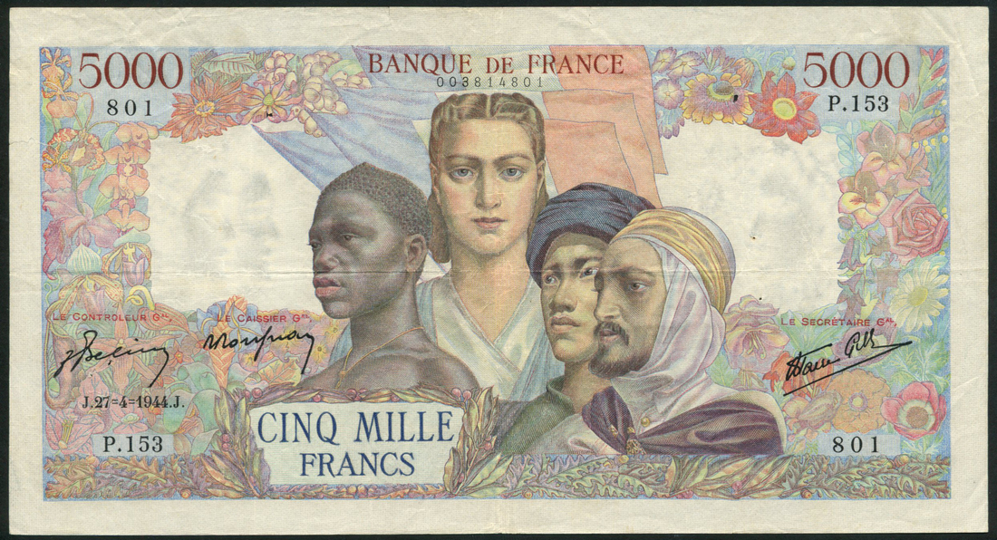 Banque de France, 5000 francs, 27 April 1944, serial number P.153-801, multicoloured, France at centre with allegorical figures representing Empire, floral background, signatures of Belin, Rousseau and Favre-Gilly