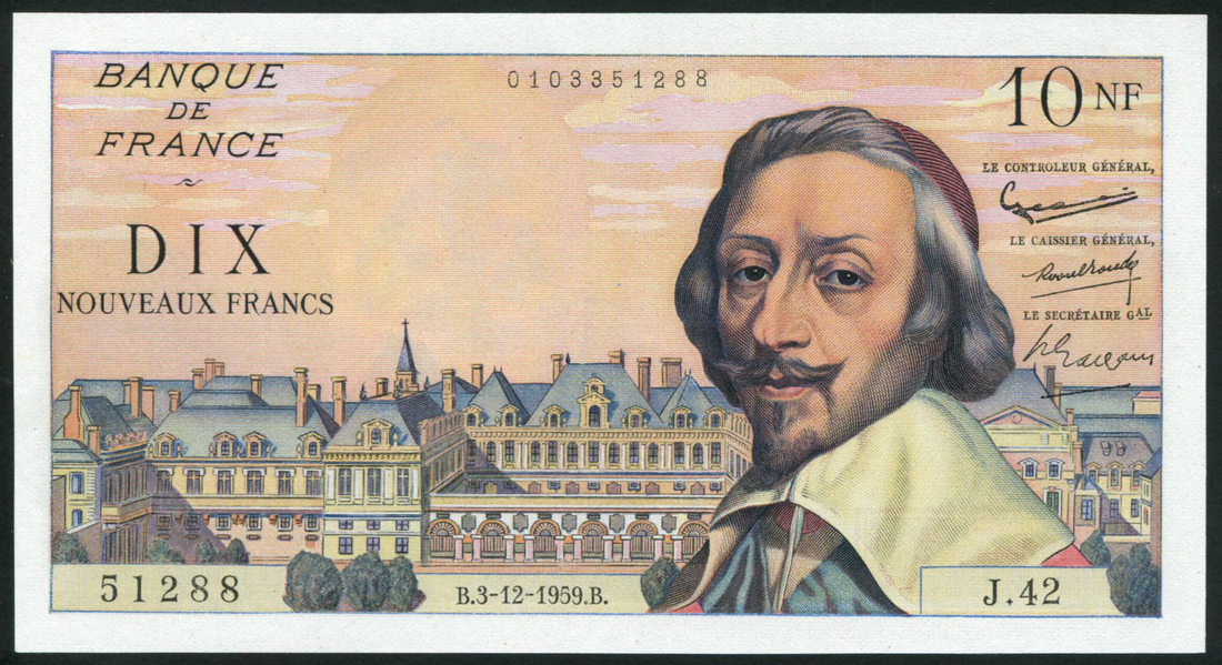 Banque de France, 10 nouveaux francs, 3 December 1959, serial number J.42 51288, multicolour, portrait Armaund du Plessis, Cardinal Richelieu at right (and on reverse), Palais Royal across centre, reverse, town gate