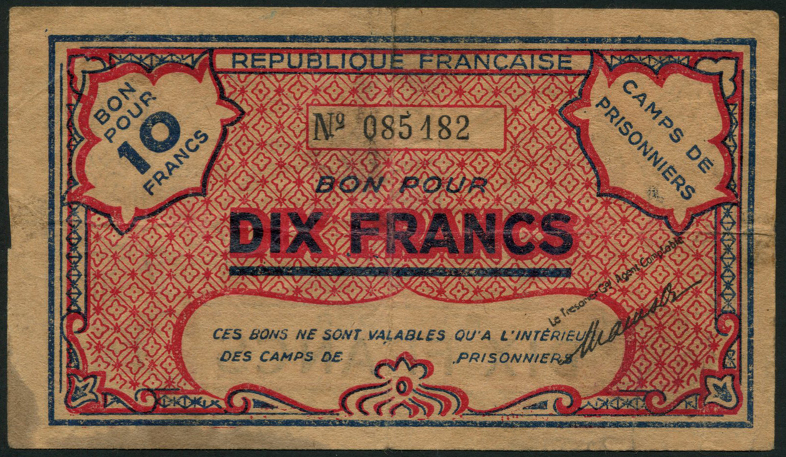 Republique Francaise, Camps de Prisonniers, North Africa, 5 francs, ND (World War II), serial number 031768, green and red, 10 francs, serial number 085182, blue and red, both arabesque designs in field, bearded Arab in turban at left