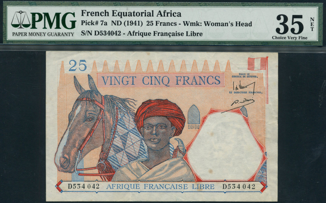 (x) French Equatorial Africa, 25 francs, ND (1941), serial number D534042, 100 francs, ND (1947), serial number U.23 69644, 50 francs, ND (1957), serial number S.5 59519,