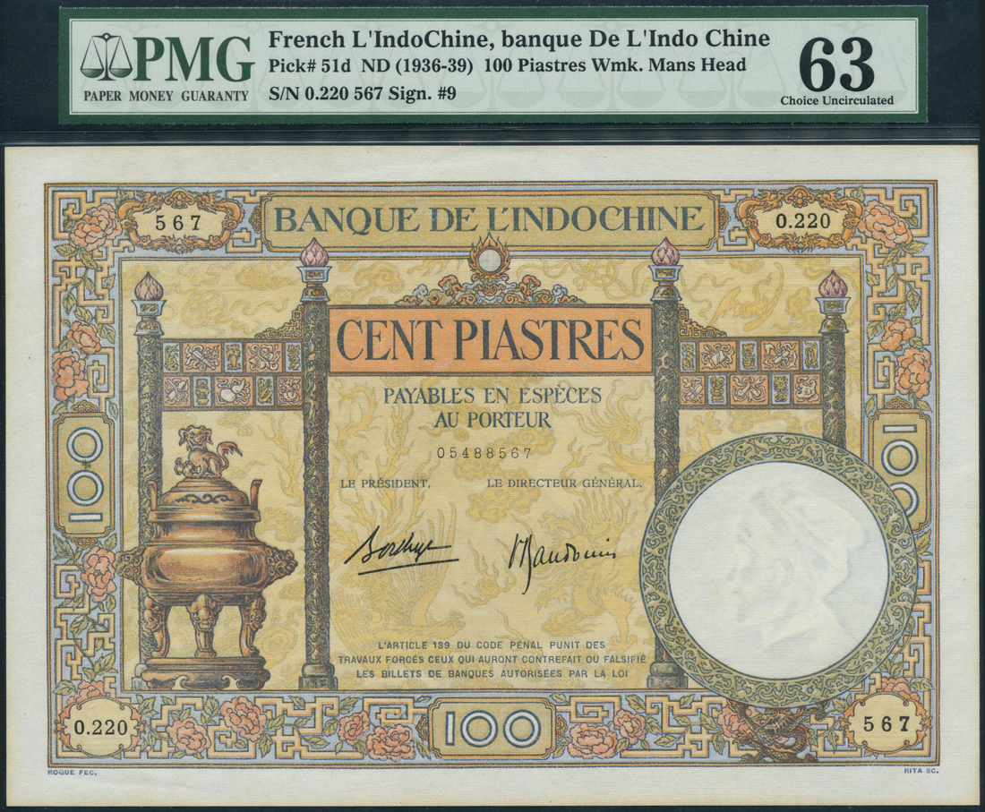 (x) Banque De L'Indo-Chine, 10 cents, ND (1920), serial number 8,474,737, blue, 100 piastres, ND (1936-1939), serial number 0.220 567, multicolour, 500 piastres, ND (1939), serial number V.8 917, multicolour