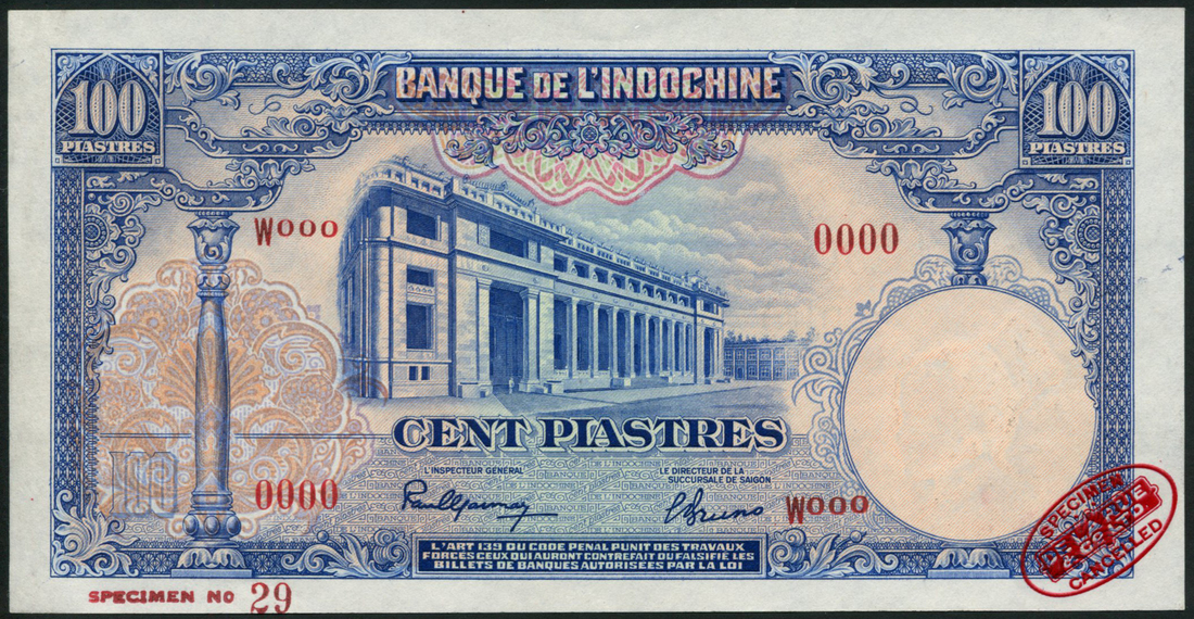 (†) Banque de L'Indo-Chine, French Indo-China, specimen 100 Piastres, ND (1946), serial number W0000000, blue and multicoloured, bank building at centre, ornate pillars at left and right, reverse junks in Halong Bay, overprinted with one De La Rue specimen oval in red on obverse only, Specimen No 29 in lower left margin