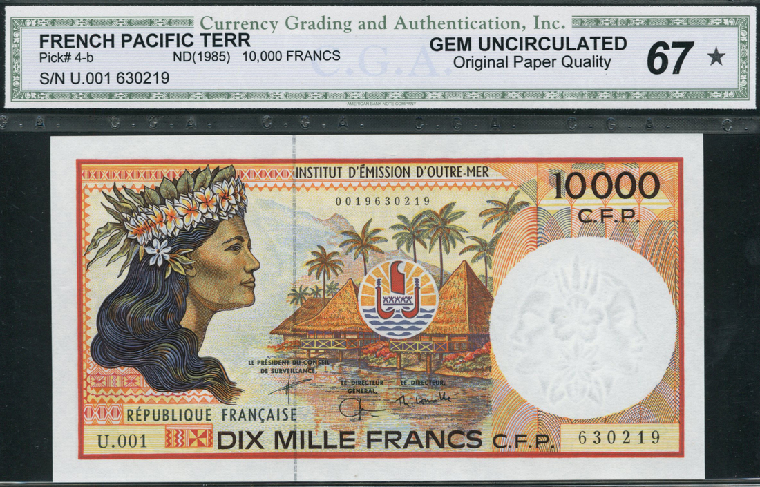 Institut d'Emission d'Outre Mer, 10000 francs, ND (1985), serial number U.001 630219, orange and multicolour, woman with ornate headdress at left, village bungalows at centre, reverse, tropical fish at centre, wood carving at far right
