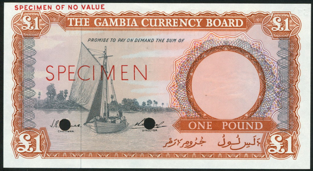 (†) Gambia Currency Board, colour trial 10/- and £1, ND (1964), first blue, second orange-brown, both with sailing boat at left, value at each corner, two cancellation holes and overprinted SPECIMEN