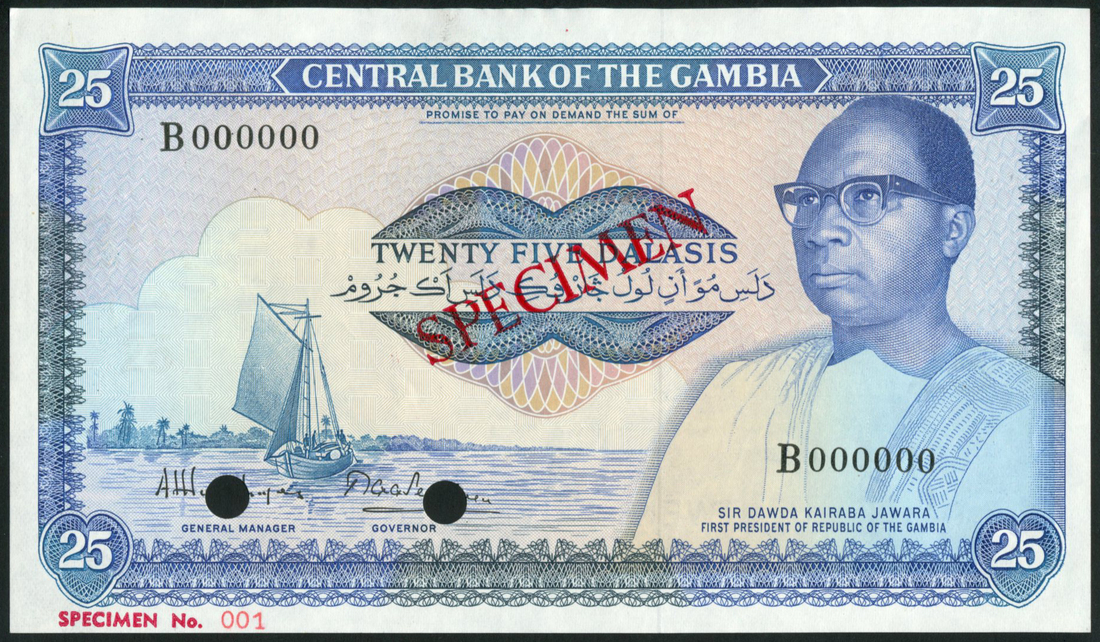 (†) Central Bank of Gambia, a group of specimens of the ND (1971-87) issues comprising 1 Dalasi, serial number Z 000000, purple; 5 Dalasis, serial number AC 000000, red; 10 Dalasis, serial number L 000000; and 25 Dalasis, serial number B 000000, blue, all signature 8, President Dawda Kairaba Jawara at right, sailing boat on River Gambia at left, all overprinted SPECIMEN in red on obverse and reverse and SPECIMEN No 1 in lower left margins, two punch holes