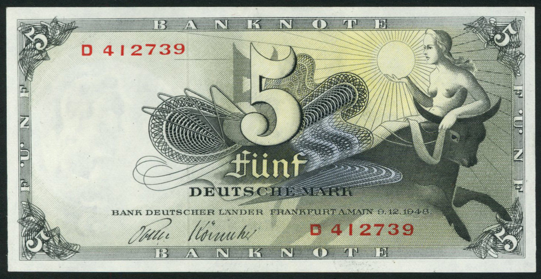 Bank Deutscher Lander, 5 marks, ND (1950), serial number D412739, black, green and yellow, Europa sitting on a bull holding the Sun at right, value at centre and each corner