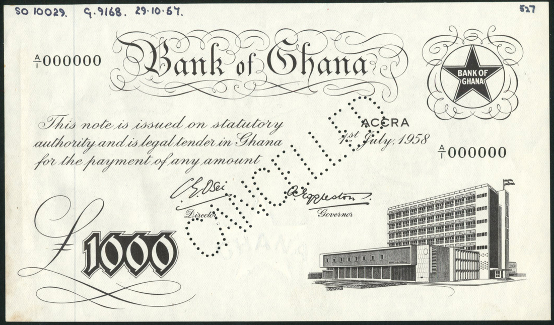 (†) Bank of Ghana, specimen £1000, Accra, 1 July 1958, serial number A/1 000000, black, bank emblem at top right, bank building at low right, value at low left, perforated CANCELLED