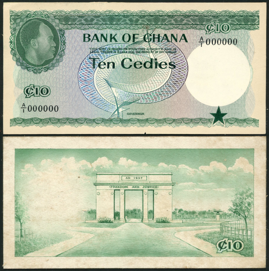(†) Bank of Ghana, an obverse and reverse composite essay with artwork on card for 10 Cedis, ND (1965), serial number A/1 000000, no signatures, green on multicoloured underprint, portrait of Kwame Nkrumah at top left, value at lower left and upper right, Ghana star at lower right, reverse Freedom and Justice Arch, Independence Square, Accra