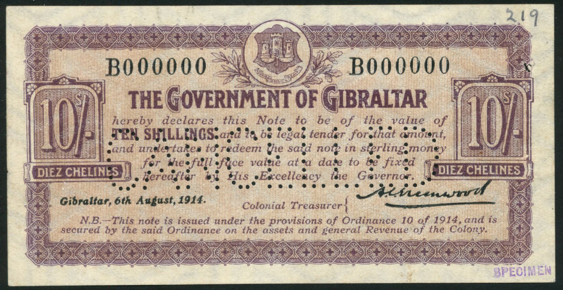 (†) Government of Gibraltar, specimen 10/-, 6 August 1914, serial number B000000, uniface, lilac on pink underprint, arms at top centre, value at left and right, perforated CANCELLED