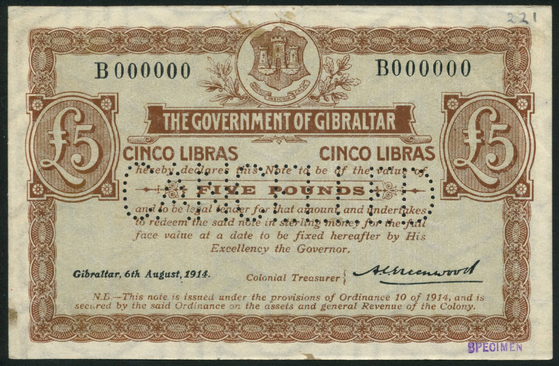 (†) Government of Gibraltar, specimen £5, 6 August 1914, serial number B000000, uniface, brown on pale green underprint, arms at top centre, value at left and right, perforated CANCELLED