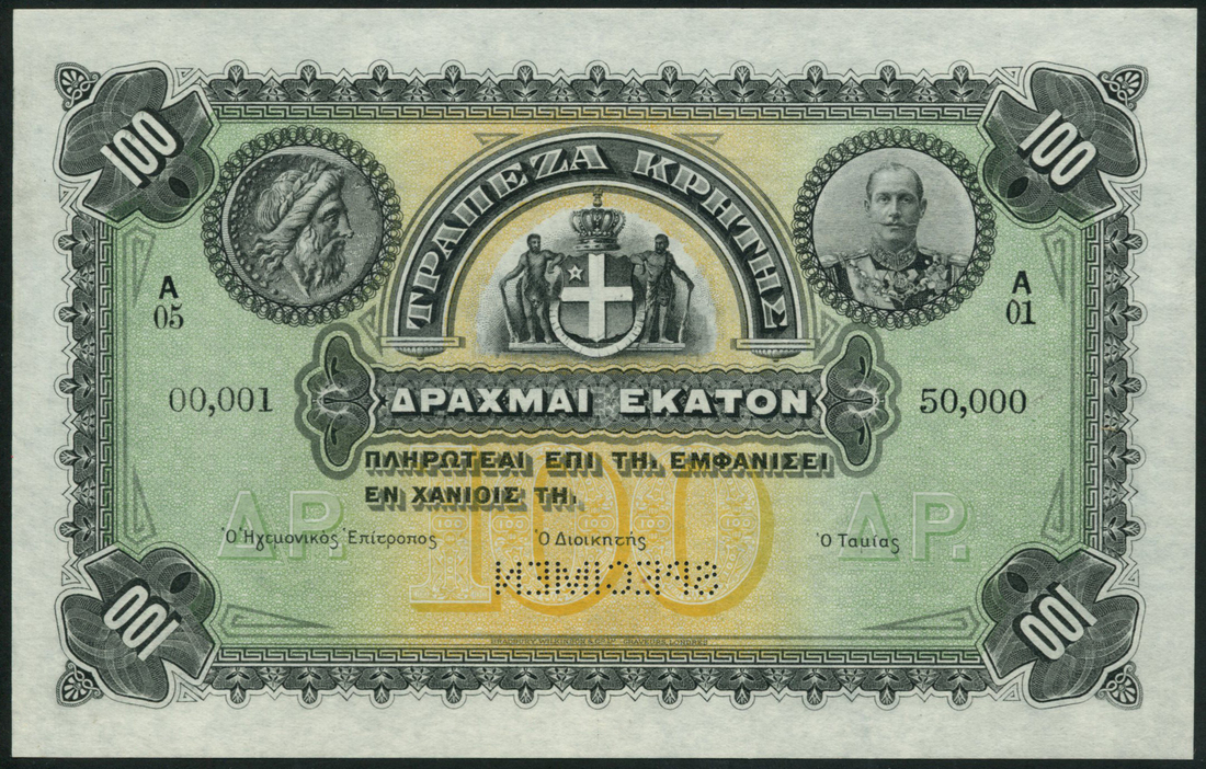 (†) Bank of Crete, specimen 25 drachmai, ND (ca 1900), serial number 000001-300000, black, orange and pale blue, arms top centre flanked by Poseidon and King George, also specimen 100 drachmai, serial number 00001-50000, black, green and pale orange, arms top centre flanked by Zeus and King George I