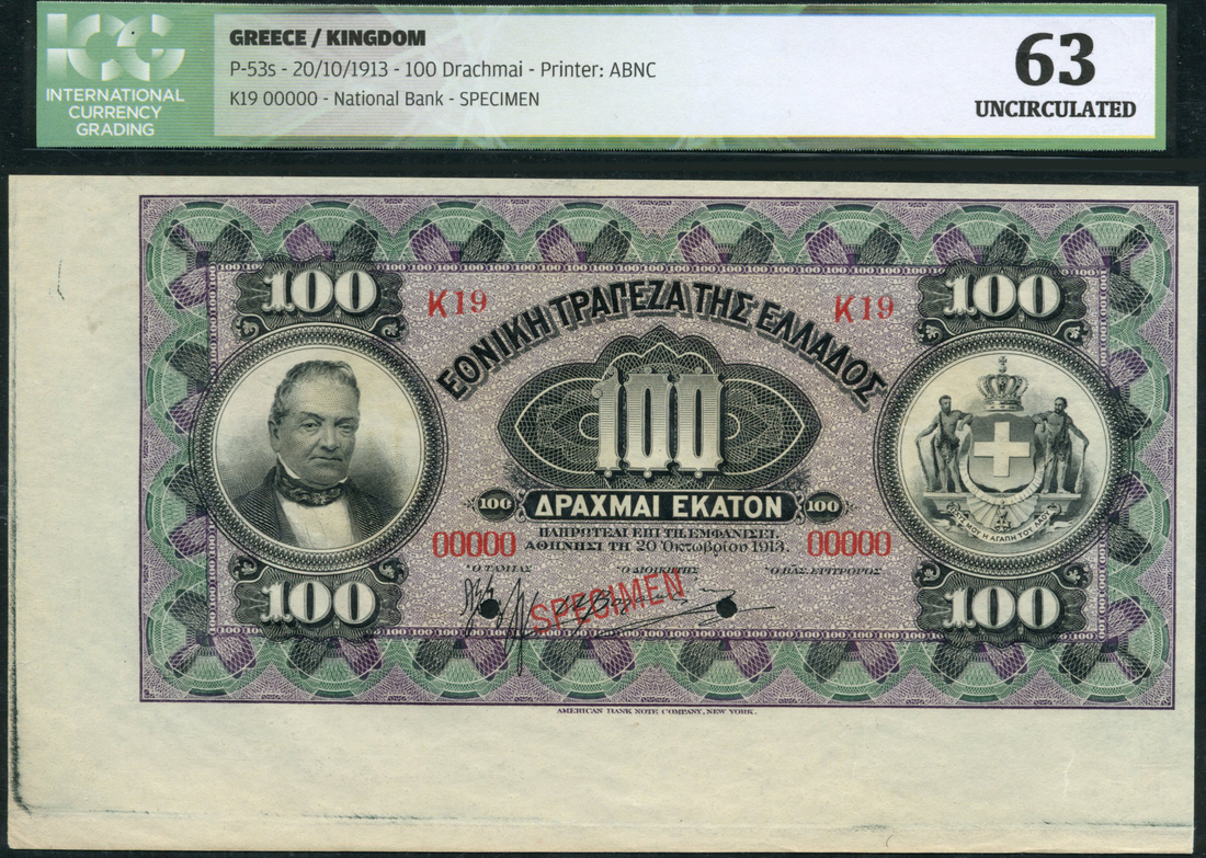 (x) National Bank of Greece, specimen 100 drachmai, 20 October 1913, red serial number K19 00000 violet green and black, George Stavros at left, arms of King George I at right, value at centre, two printed signatures