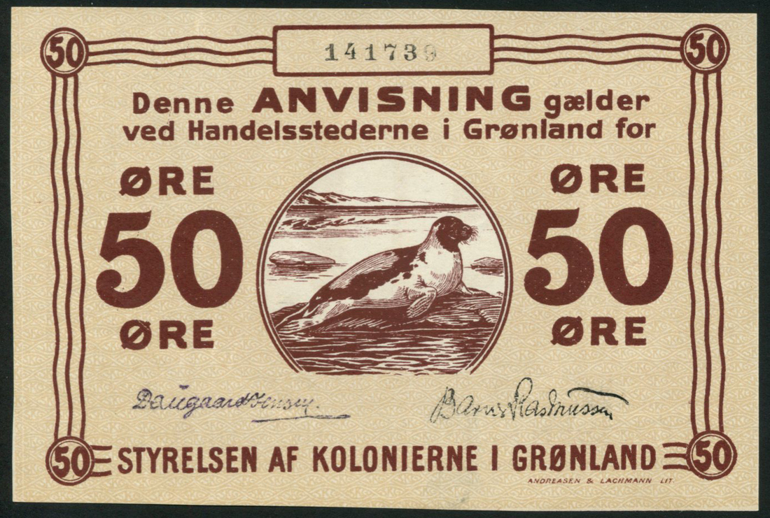 Greenland, State Notes, 50 ore, ND (1913), serial number 141739, brown on tan underprint, saddleback seal at centre, value at left and right, small signatures, also 25 ore, ND (1913), red, eider duck at centre, large signatures