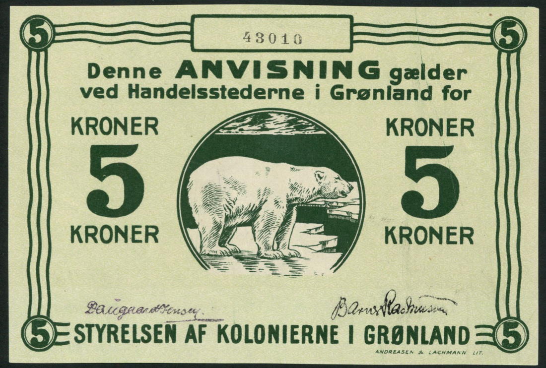 Greenland, State Notes, 5 kroner, ND (1913), serial number 43010, dark green on pale green underprint, polar bear on ice at centre, value at left and right, small signatures