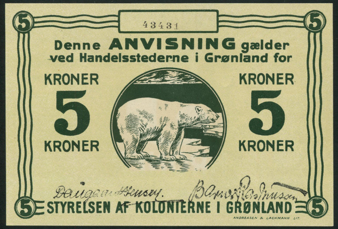 Greenland, State Notes, 5 kroner, ND (1913), serial number 43431, dark green on pale green underprint, polar bear on ice at centre, value at left and right, large signatures