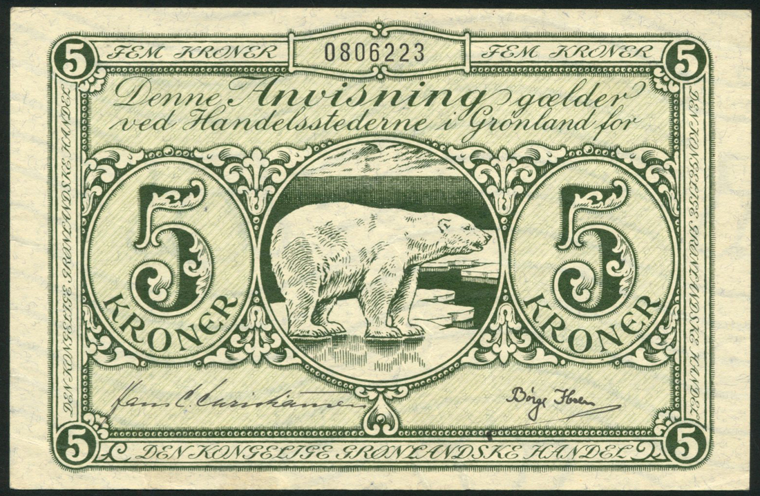 Greenland, 5 kroner, ND (1953-67), serial number 0806223, green and white, polar bear at centre flanked by value in circular frames, bank title and value in border, reverse, map in ornate frame at centre